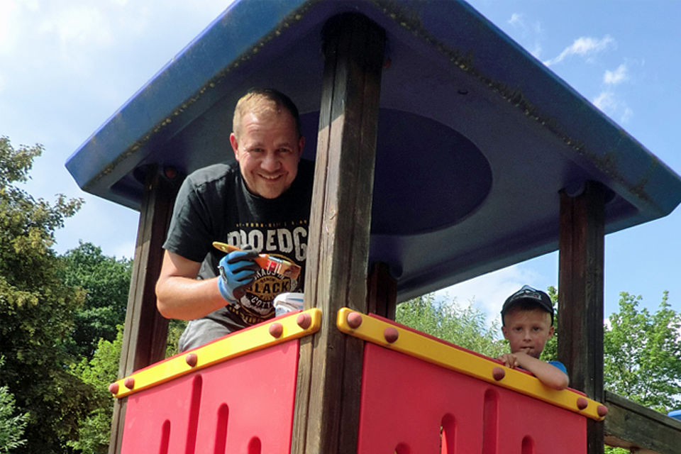 Trotz hitziger Temperaturen haben alle fleißigen Helfer motiviert und gut gelaunt den Spielgeräten, Bänken und Schuppen mit Farbe neue Frische eingehaucht und viele andere notwendige Gartenarbeiten übernommen. Das gemeinsame Schwitzen und Anpacken hat sich auf jeden Fall gelohnt, denn das Ergebnis kann sich sehen lassen! Der Spaß kam natürlich auch nicht zu kurz! Nach getaner Arbeit saßen alle in gemütlicher Runde am Grill zusammen und manch einer hat eine Erfrischung mit dem Kärcher abbekommen.