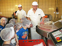 24.04.2014: Die Kinder der Betriebskita "Die kleinen Sonnenstrahlen" Aue besuchten die Fleischerei Häußler in Lößnitz und erfuhren dort viel Wissenswertes über die Wurstherstellung.