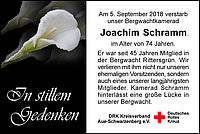 18.09.2018: Wir trauern um unseren Kameraden Joachim Schramm, dem langjährigen Vorsitzenden der Bergwacht Rittersgrün, der am 05. September 2018 im Alter von 74 Jahren verstarb.